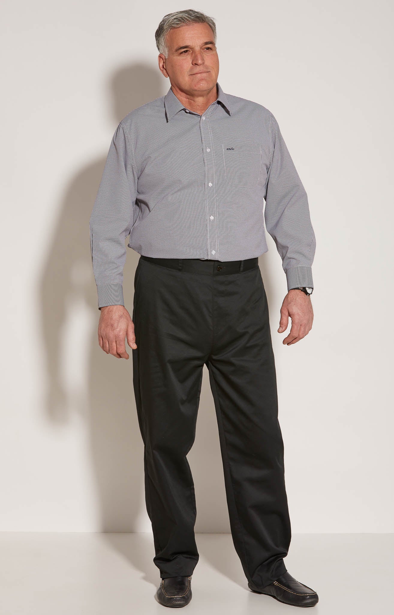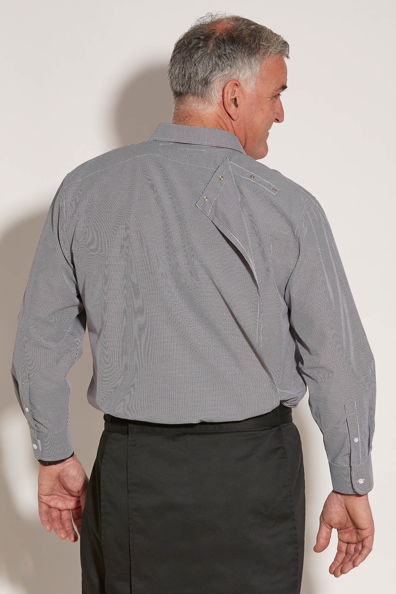 Dressing with confidence and dignity is easy thanks to this innovative Assisted Dressing Dress Shirt for Senior Men design. Micro checkered print provides texture on a jacquard base fabric. Deep tones contrast with white highlights. Half buttoned down front placket with velcro closure at the cuffs. Logo embroidery on pocket. Full back opening with snap closures means easy dressing.