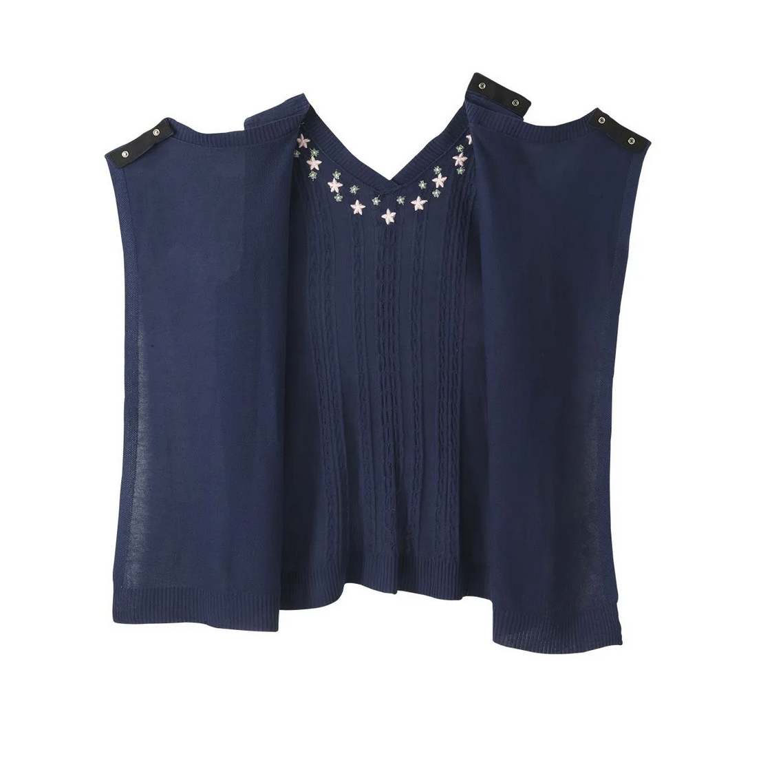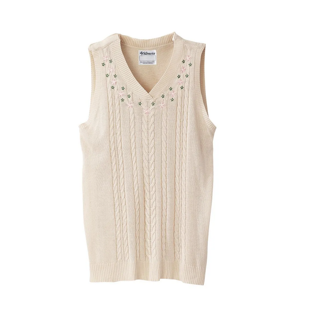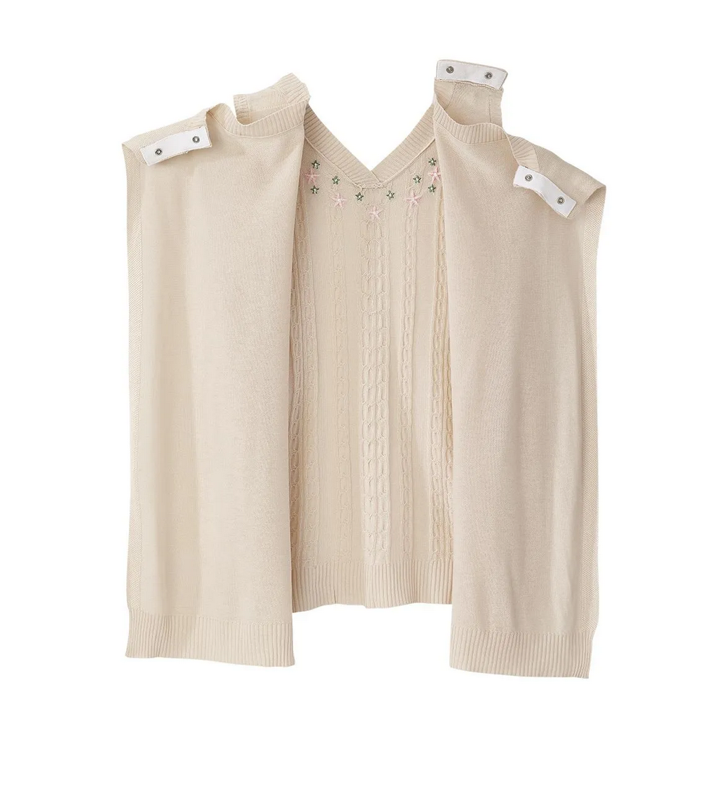 Women's Open Back Sweater Vest for Seniors is the ideal sweater for assisted dressing with both caregivers and loved ones. This adaptive sweater vest features a discrete and generous back overlap for additional coverage with snap closure at each shoulder for caregivers to easily secure this handicap garment. This vest provides added warmth, and it is beautifully embellished with delicate floral embroidery on luxuriously soft yarns for a feminine touch.